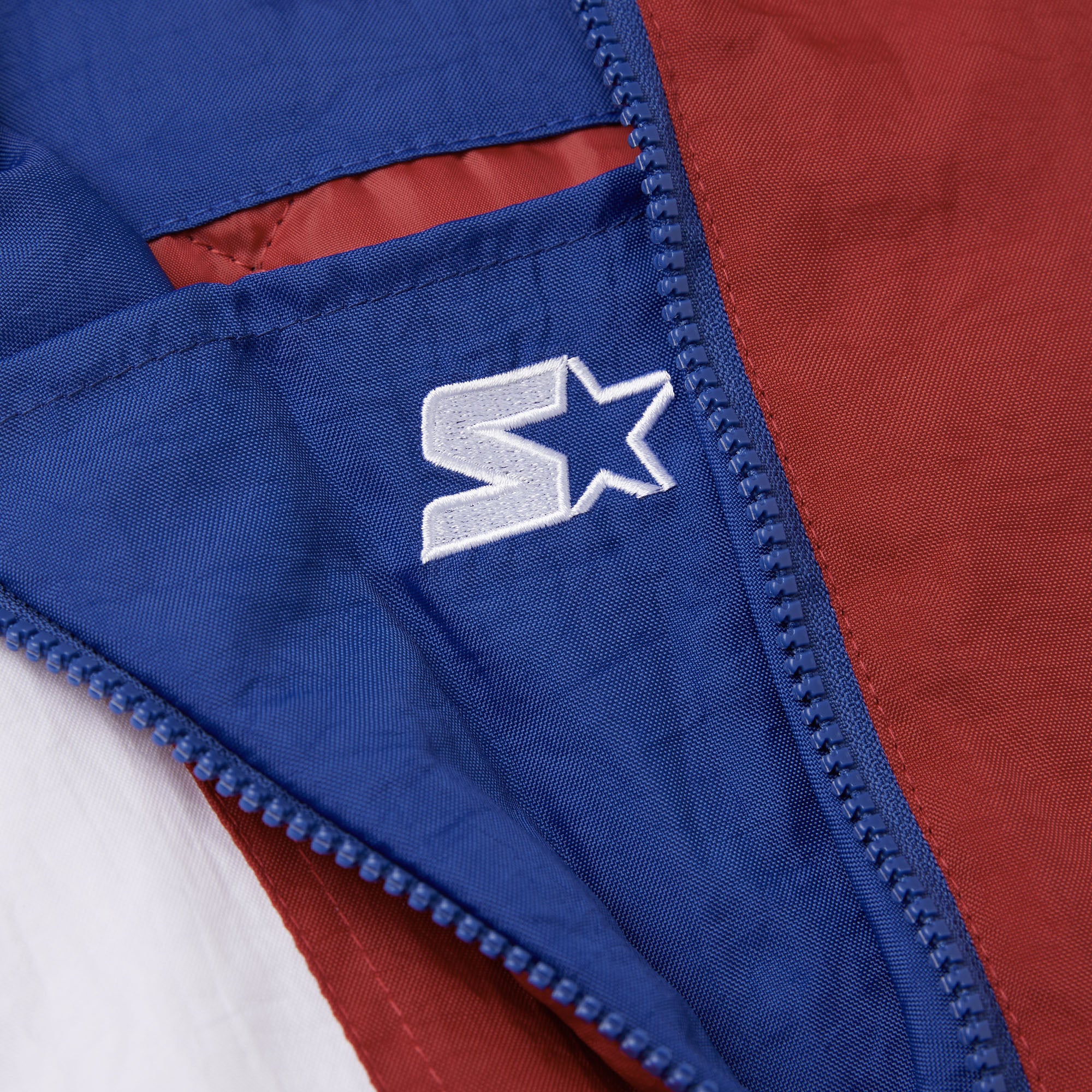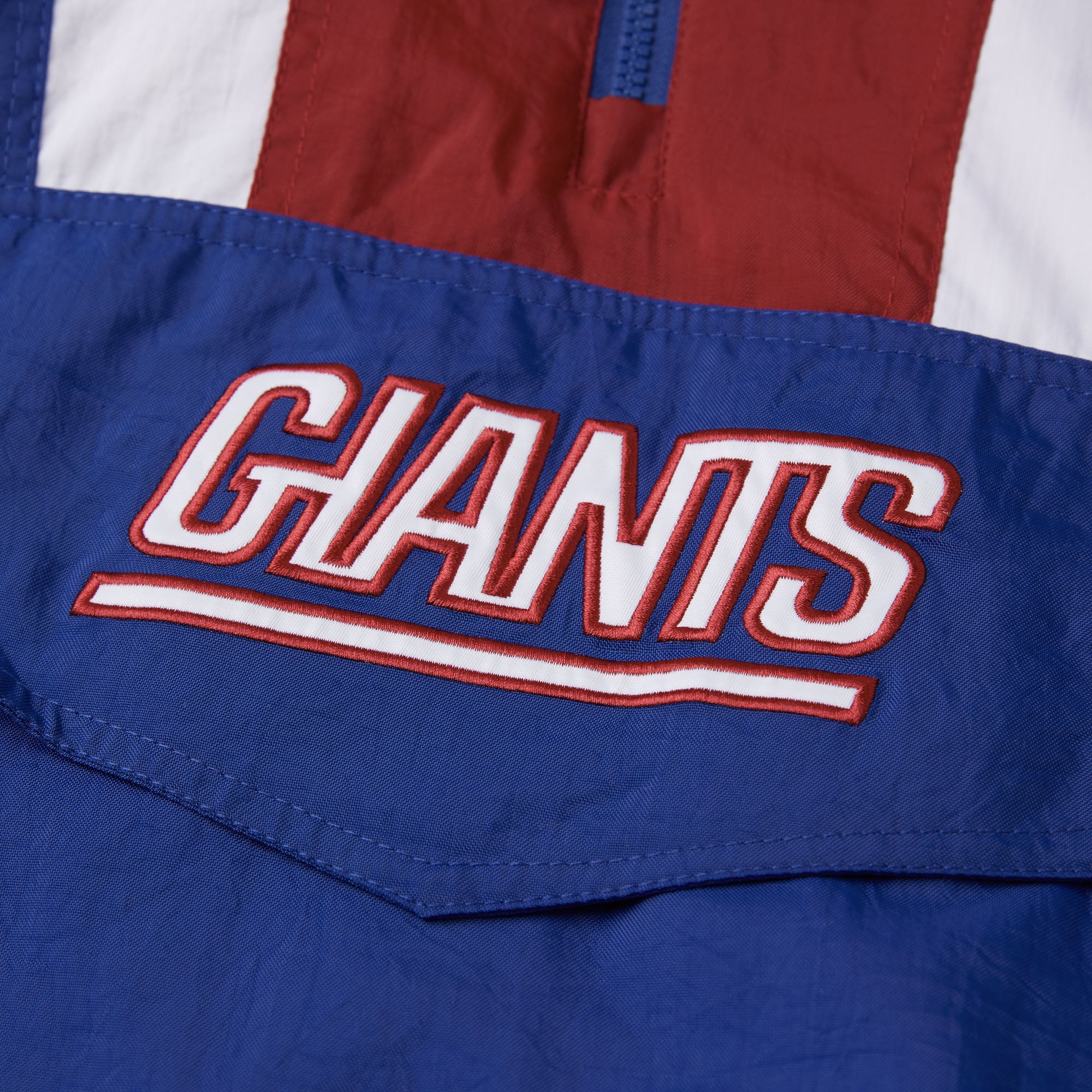 The ultimate in game day outerwear: the HOMAGE x Starter NFL Pullover Jacket. Half-zip collar, adjustable hood, classic kangaroo pocket with velcro and zip closure, and bold team colors for your one and only New York Giants: it’s a certified essential.
