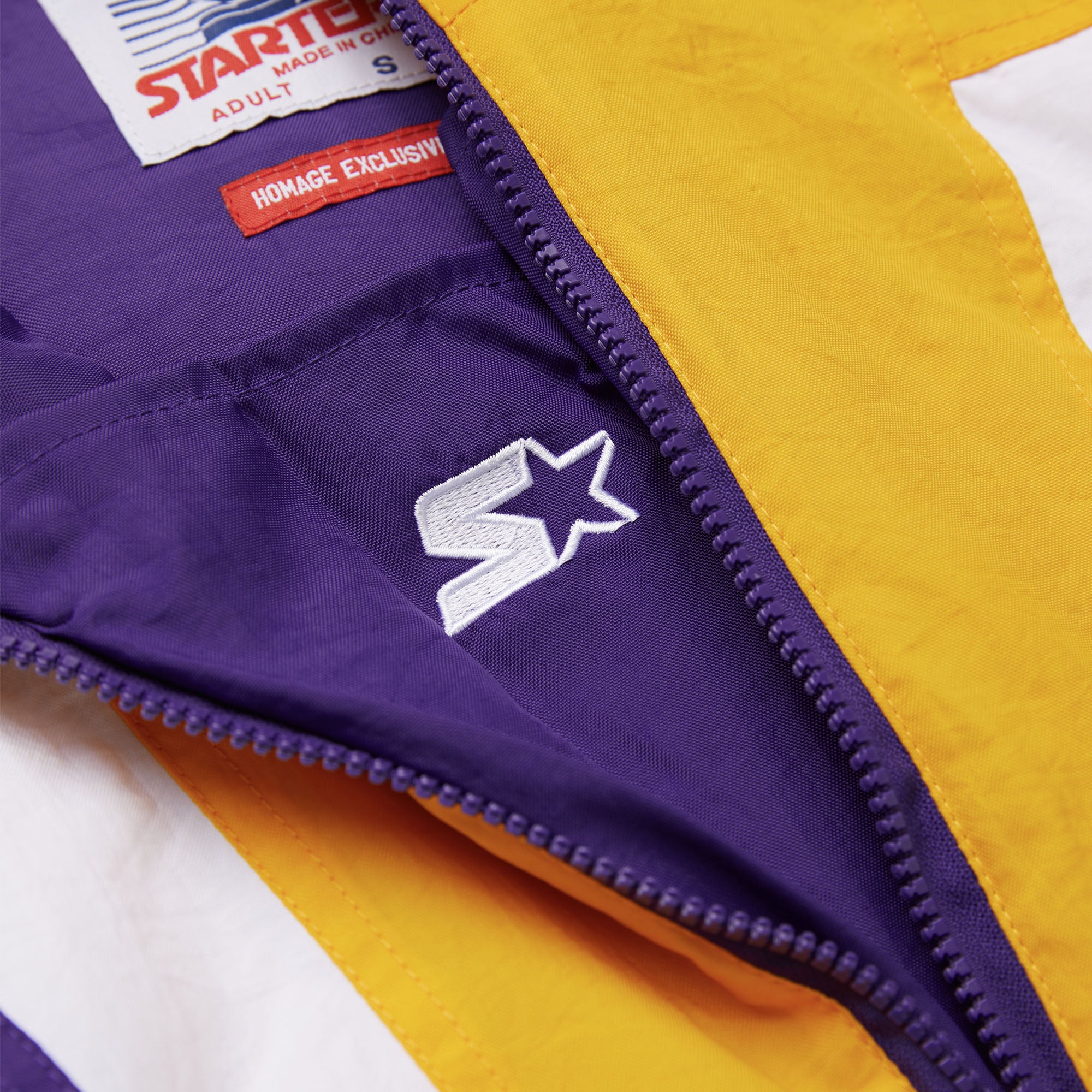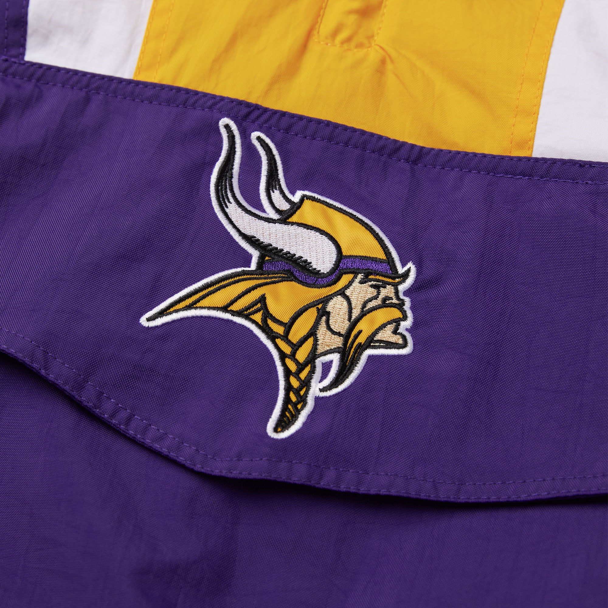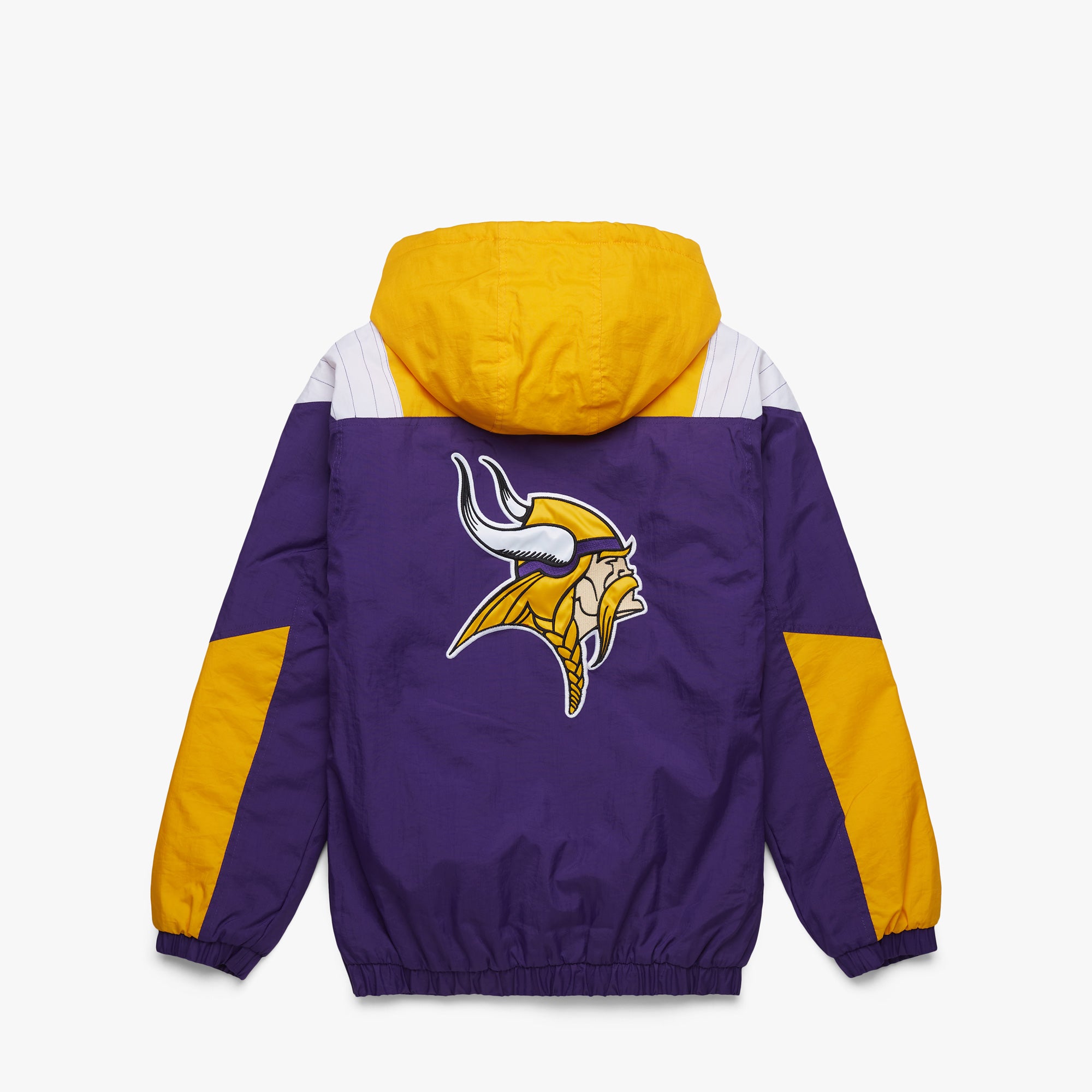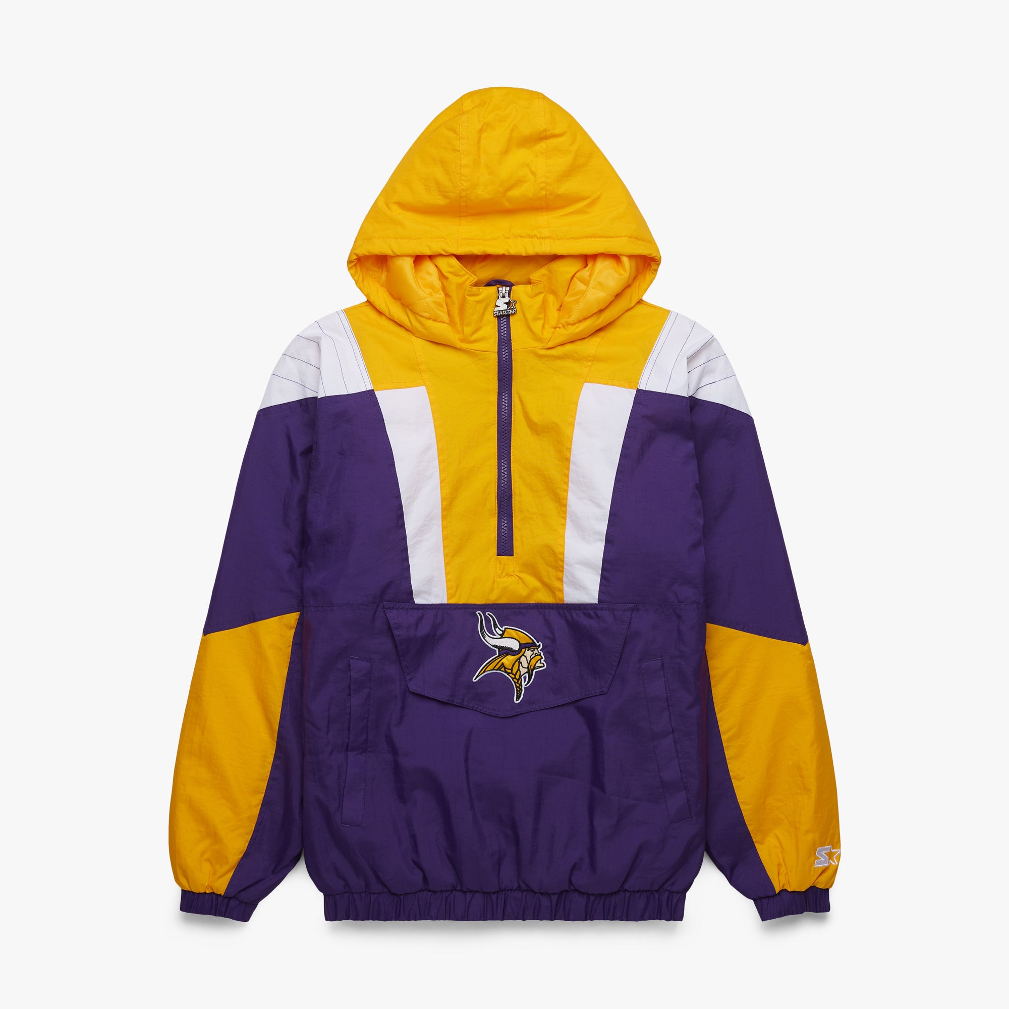 The ultimate in game day outerwear: the HOMAGE x Starter NFL Pullover Jacket. Half-zip collar, adjustable hood, classic kangaroo pocket with velcro and zip closure, and bold team colors for your one and only Minnesota Vikings: it’s a certified essential.